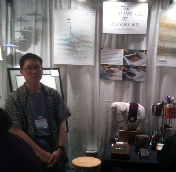 Much of the show—hundreds of dealers and hours of browsing—was the usual run of pottery (not much, but nicely done), cutting boards (by the hundreds), various clothing (from nice to excruciating), and all sorts of food (both delicious and strange; some both.) And reading and writing? Pretty much a vacuum, with one notable exception: Robert Wu.