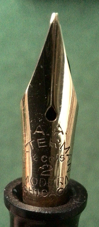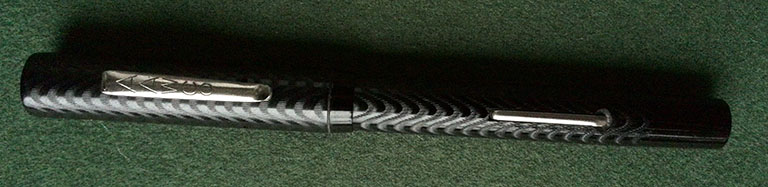 This is what chased hard rubber should look like: smooth, and so shiny you can see yourself in it. The chasing should be clear and crisp. Pair that with a nice flexible, responsive nib, and we have one of the best examples of one of the best pens ever made.